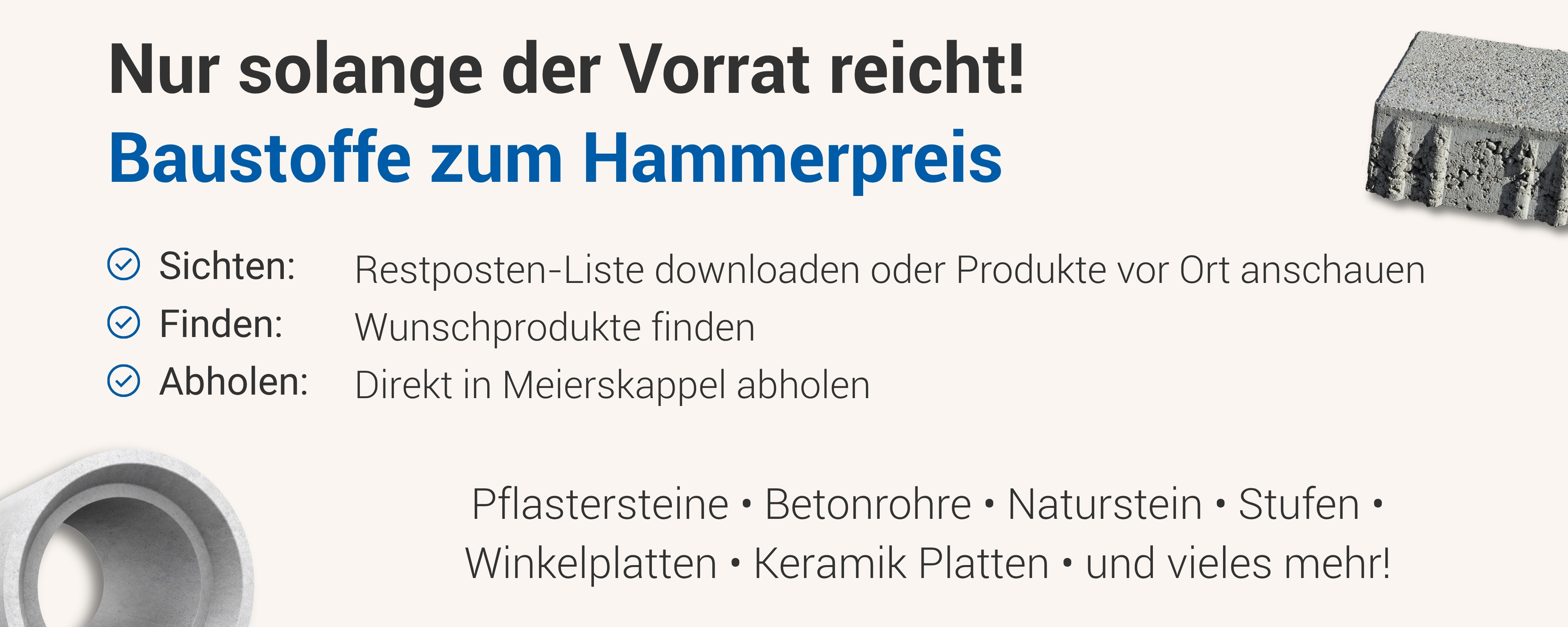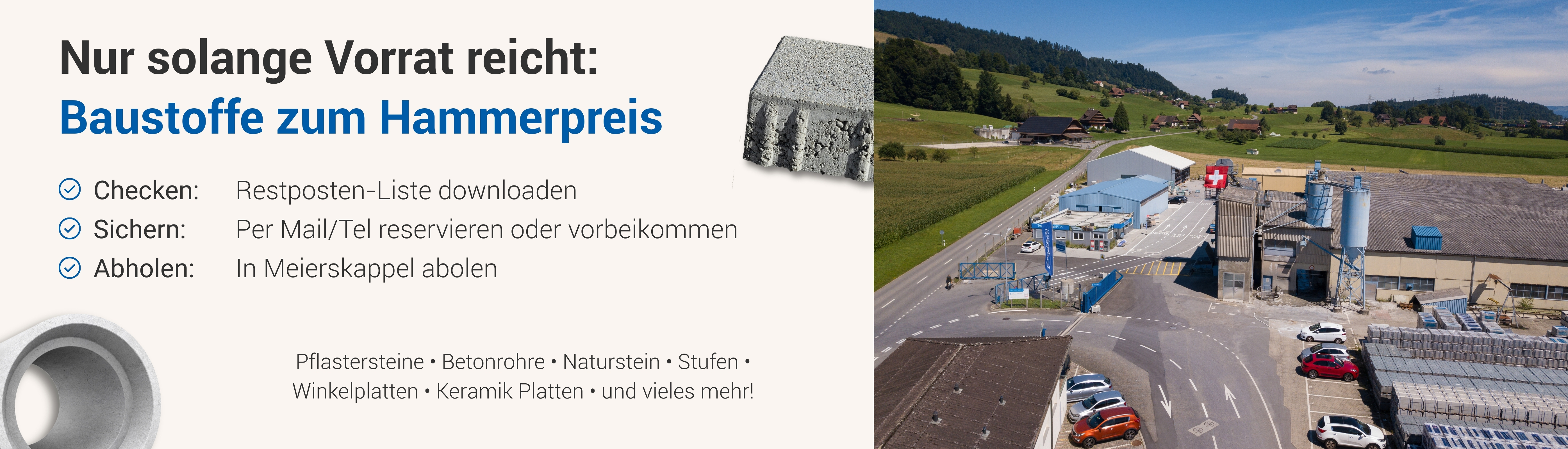 Günstige Beton- und Natursteinprodukte für kleine und grosse Bau- und Gartenprojekte. Die Restpostenliste mit allen Artikeln wie Pflastersteinen, Terrassenplatten, Betonrohren, Mauersteinen usw. finden Sie weiter unten.
